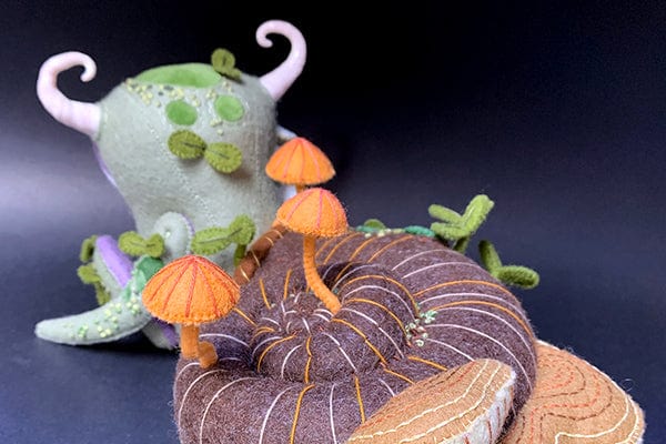 - Hannakin - 'Hermit Gastropod' - wool felt, thread, embroidery floss, Sculpey, wire and mixed media on raw pine wood base