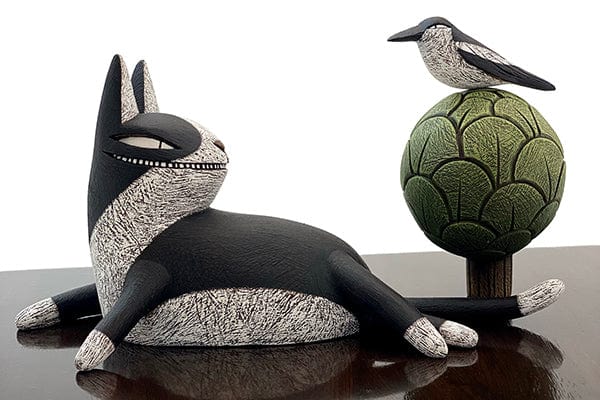 - Kim Slate - 'Safe and Sound' - clay, gouache, acrylic, wire, epoxy and walnut board