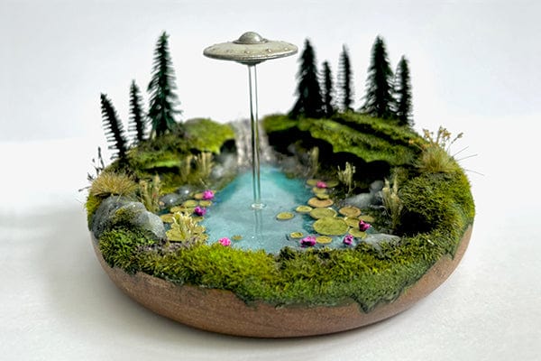 - Kim Slate - 'Peace Offering' - clay, gouache, acrylic, wire, epoxy and walnut board
