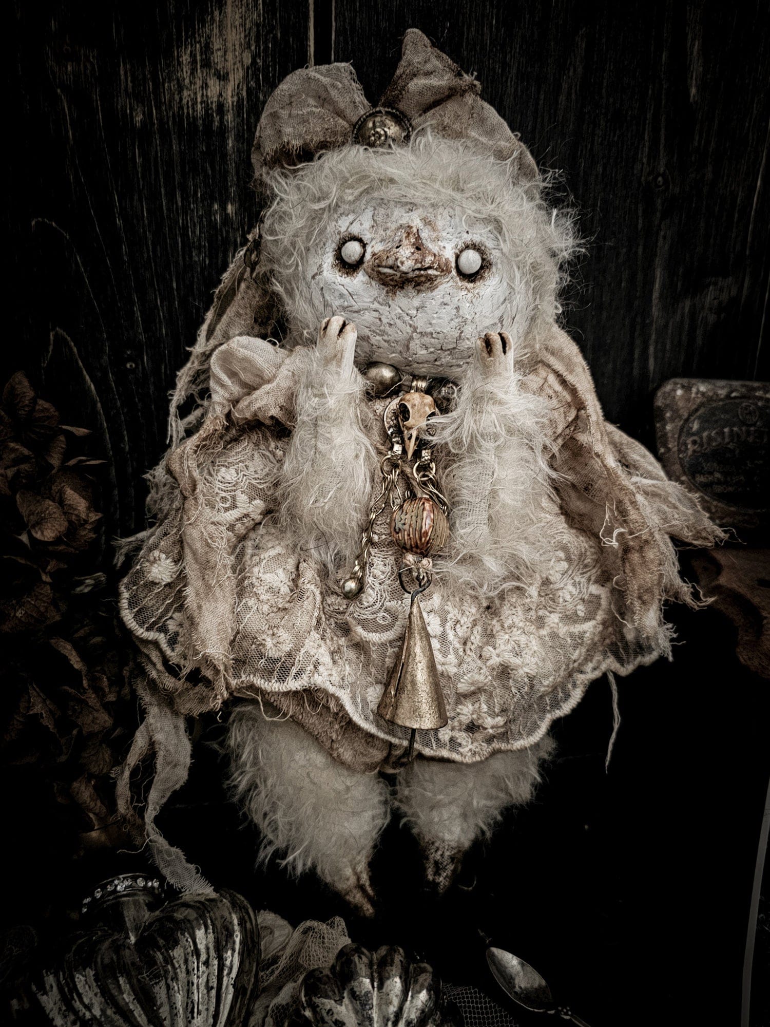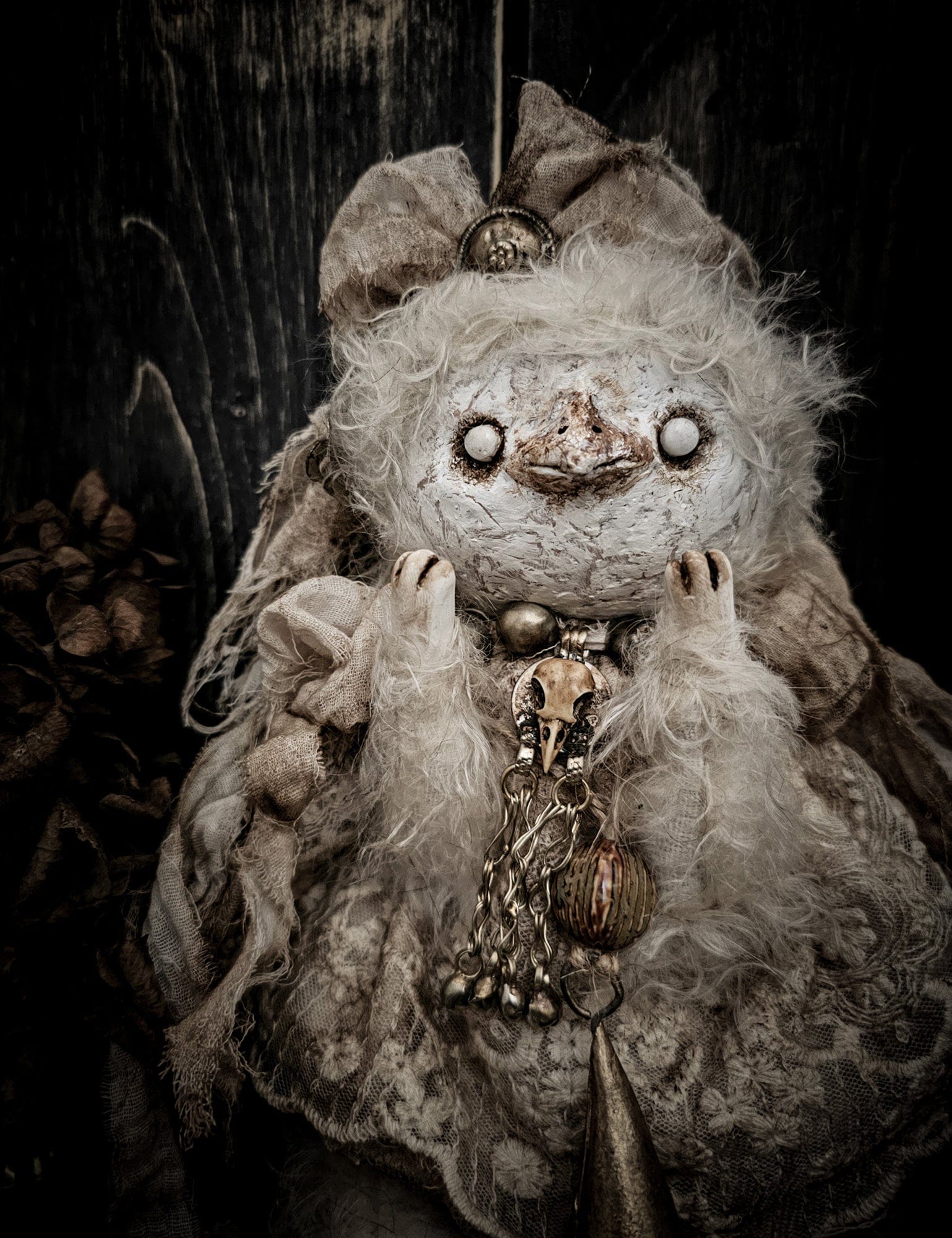 Mohair, resin, ceramic, wire and cotton sculpture with acrylic and oil paint, by Agatha Black (2026).
