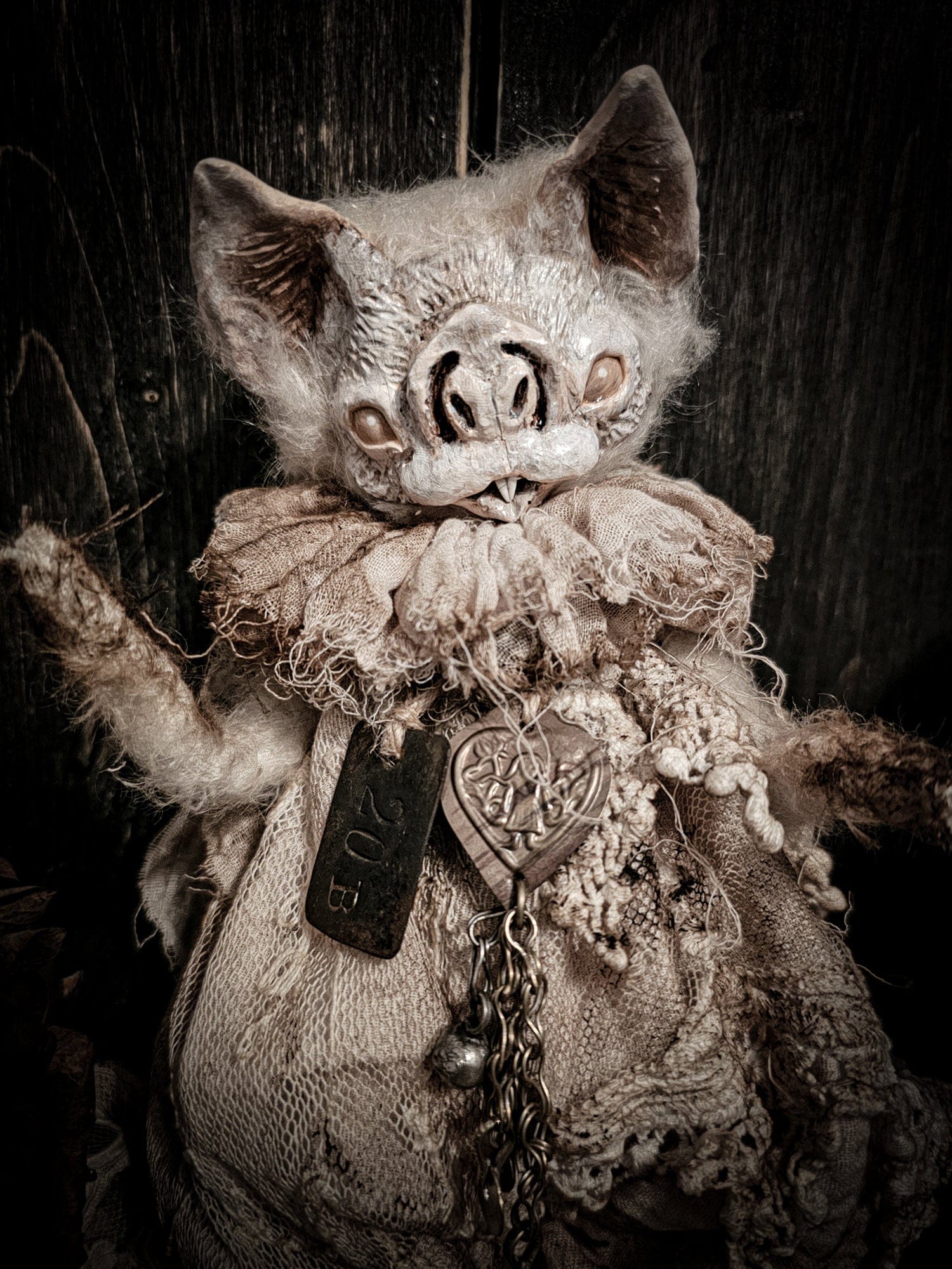 Agatha Black - 'Pale Bat' - mohair, resin, ceramic, wire, cotton, acrylic and oil paint