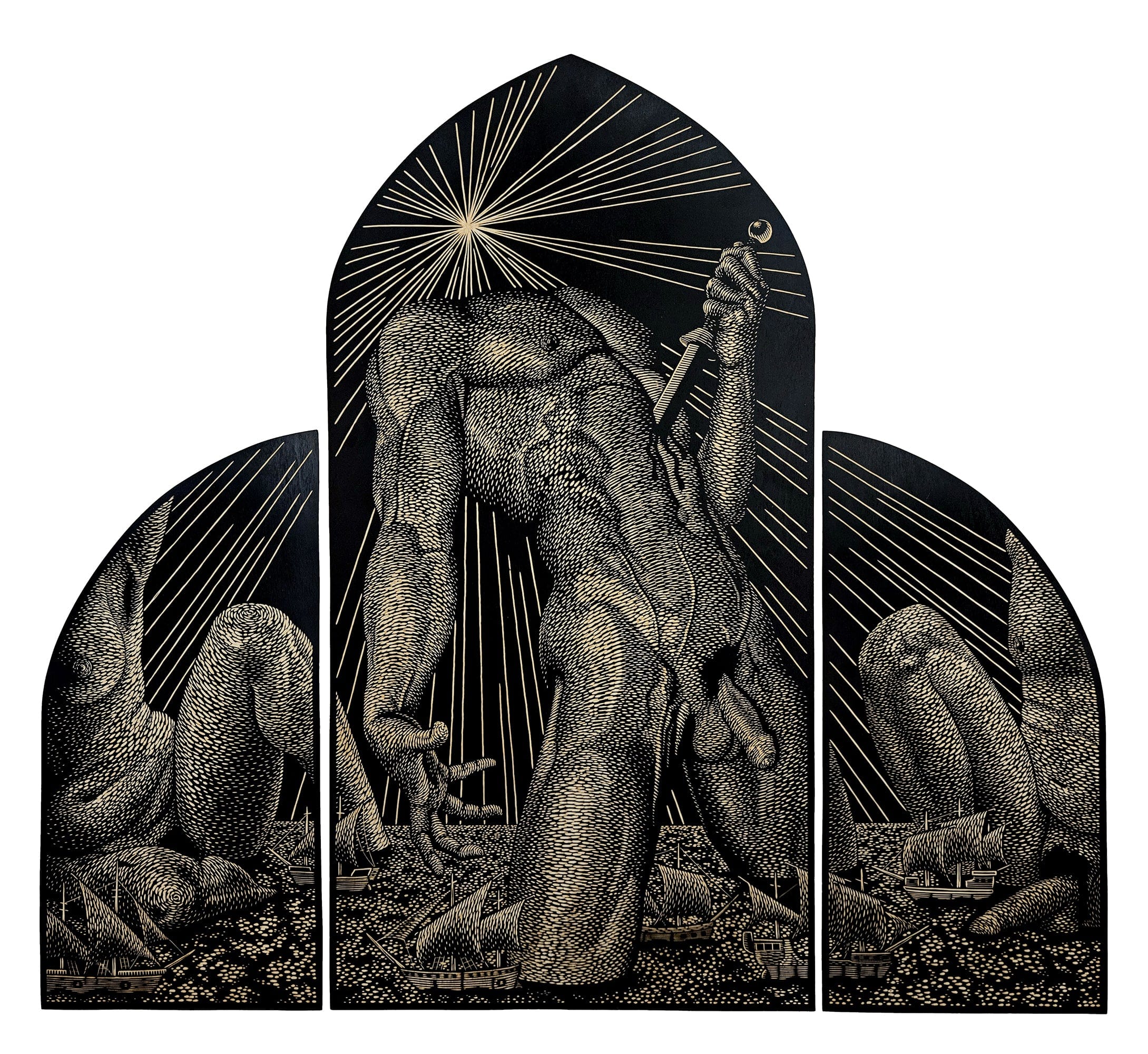 Sean Arkham - 'Colossus' - acrylic on carved birch wood triptych