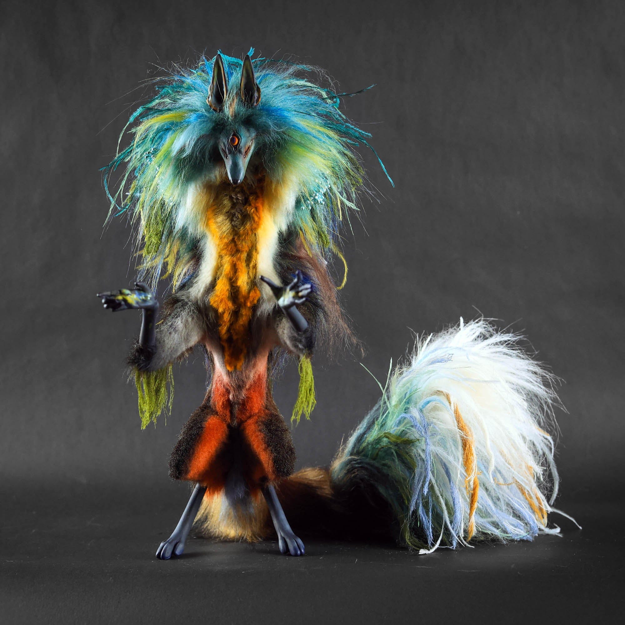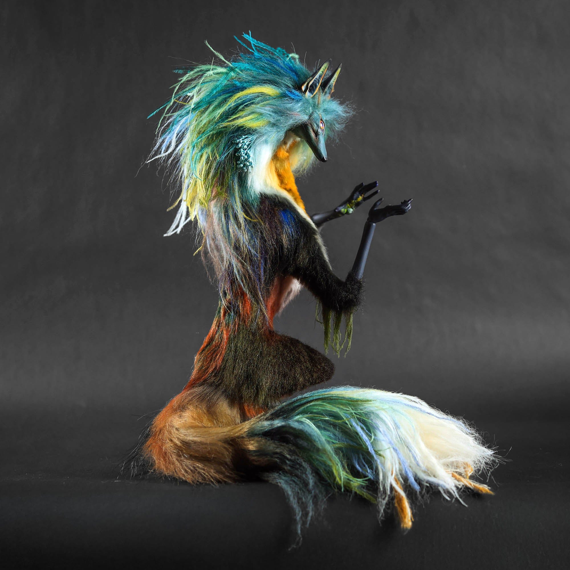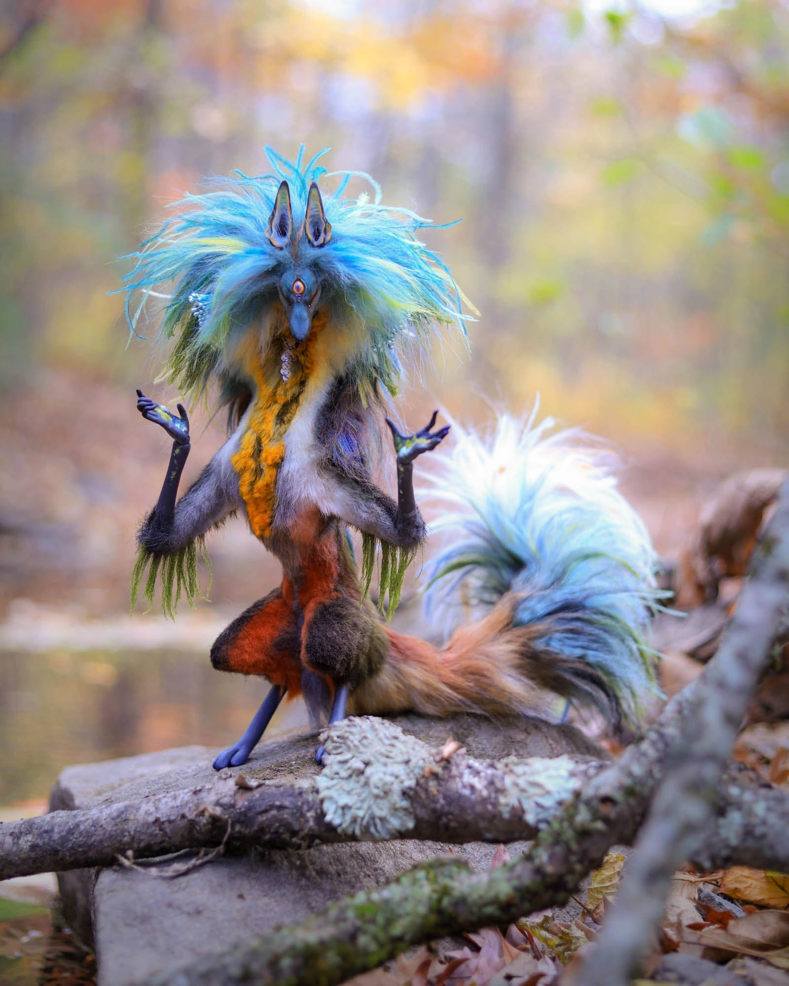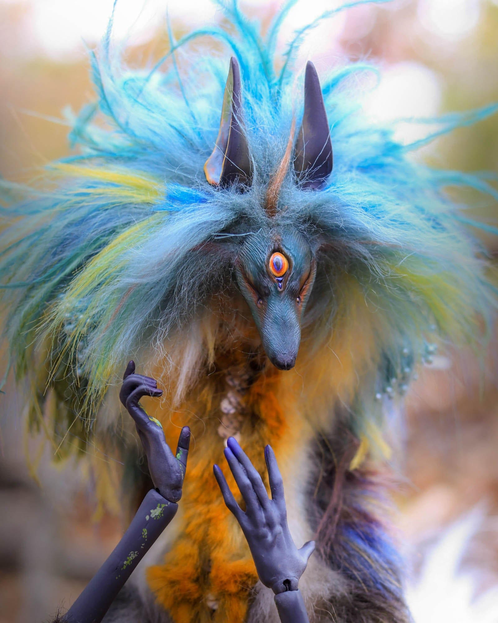 Anya Boz - 'Lichen Diki Spirit Room Guardian' - resin, epoxy clay, posable plastic joint armatures, wire, fur, fabric, feathers, faux fur, tiger eye crystal