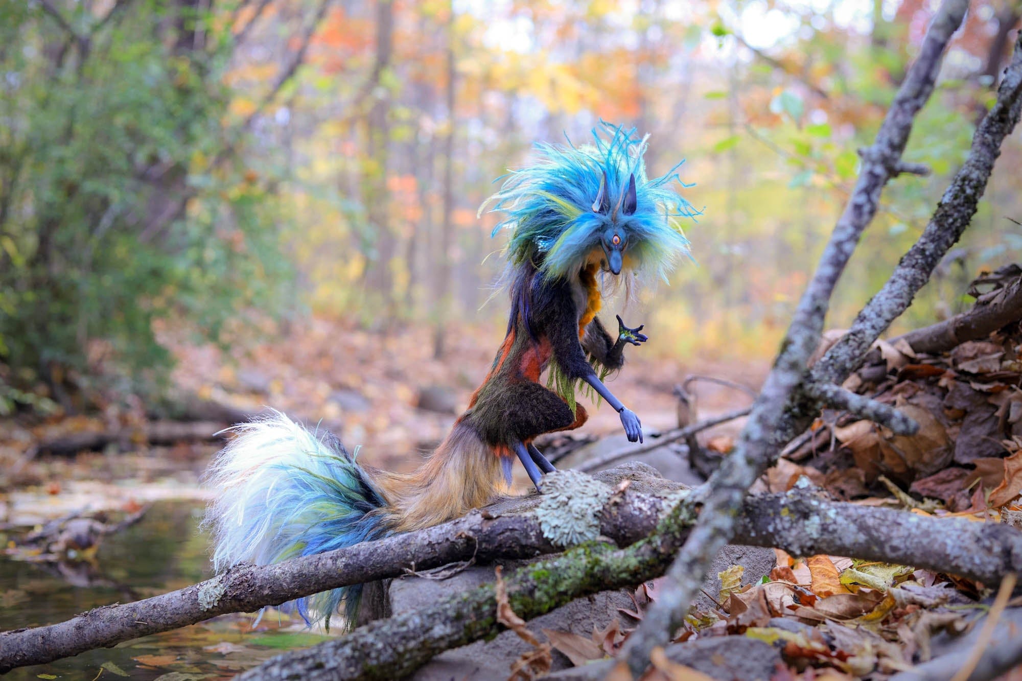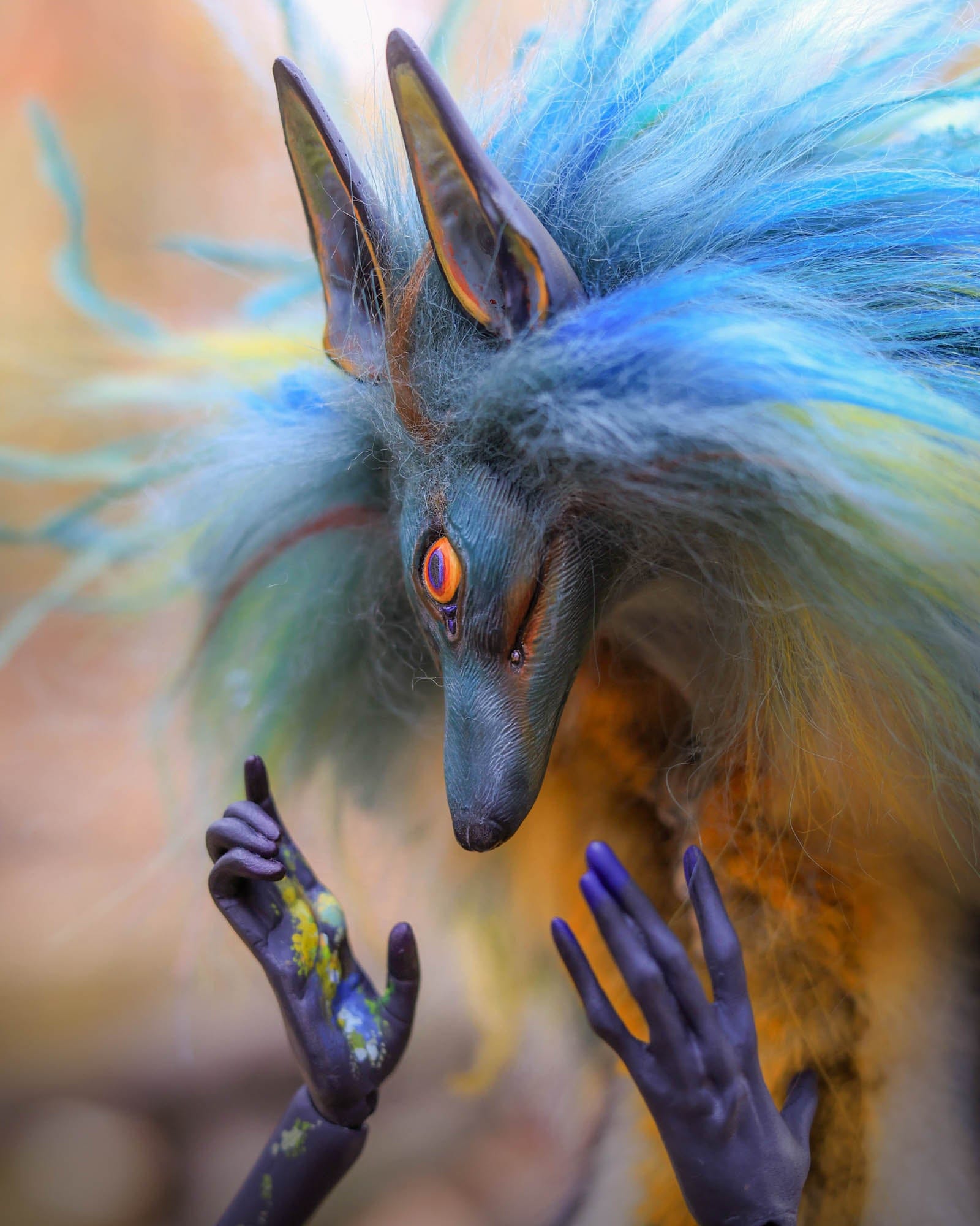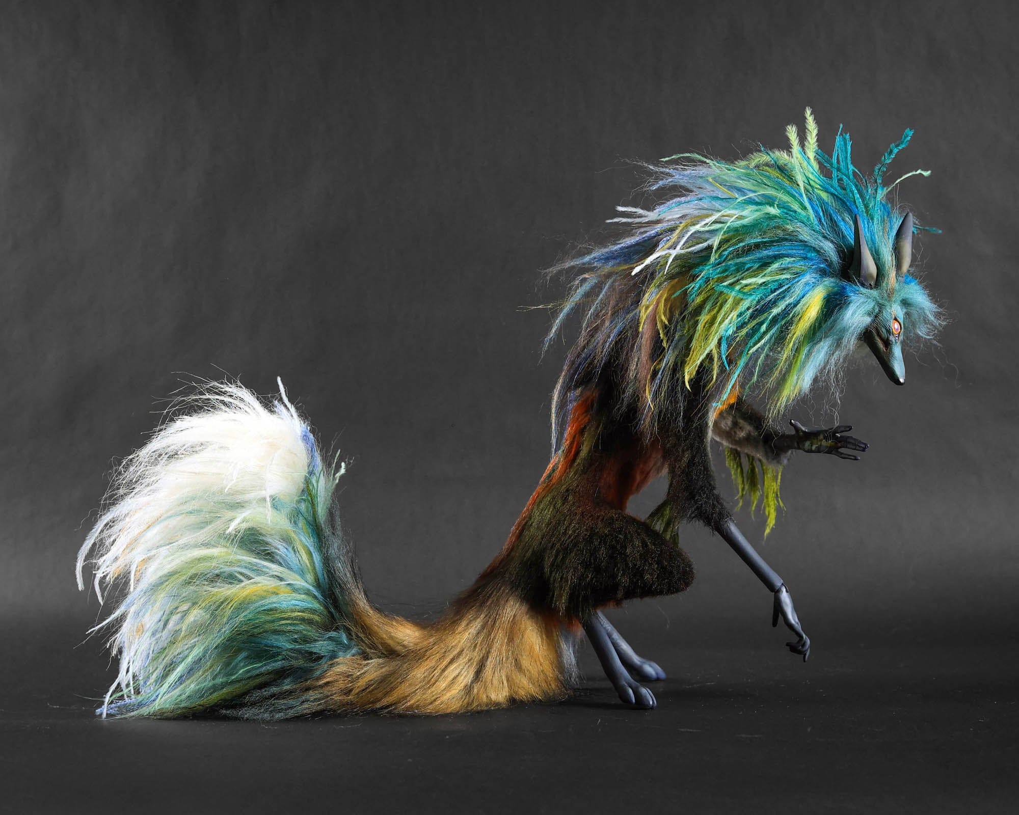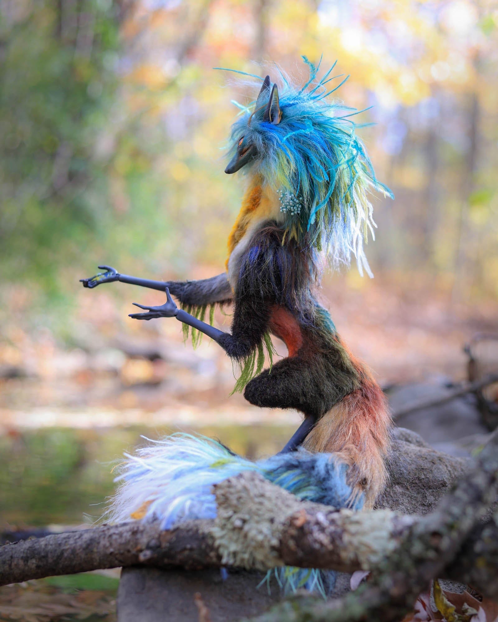 Anya Boz - 'Lichen Diki Spirit Room Guardian' - resin, epoxy clay, posable plastic joint armatures, wire, fur, fabric, feathers, faux fur, tiger eye crystal
