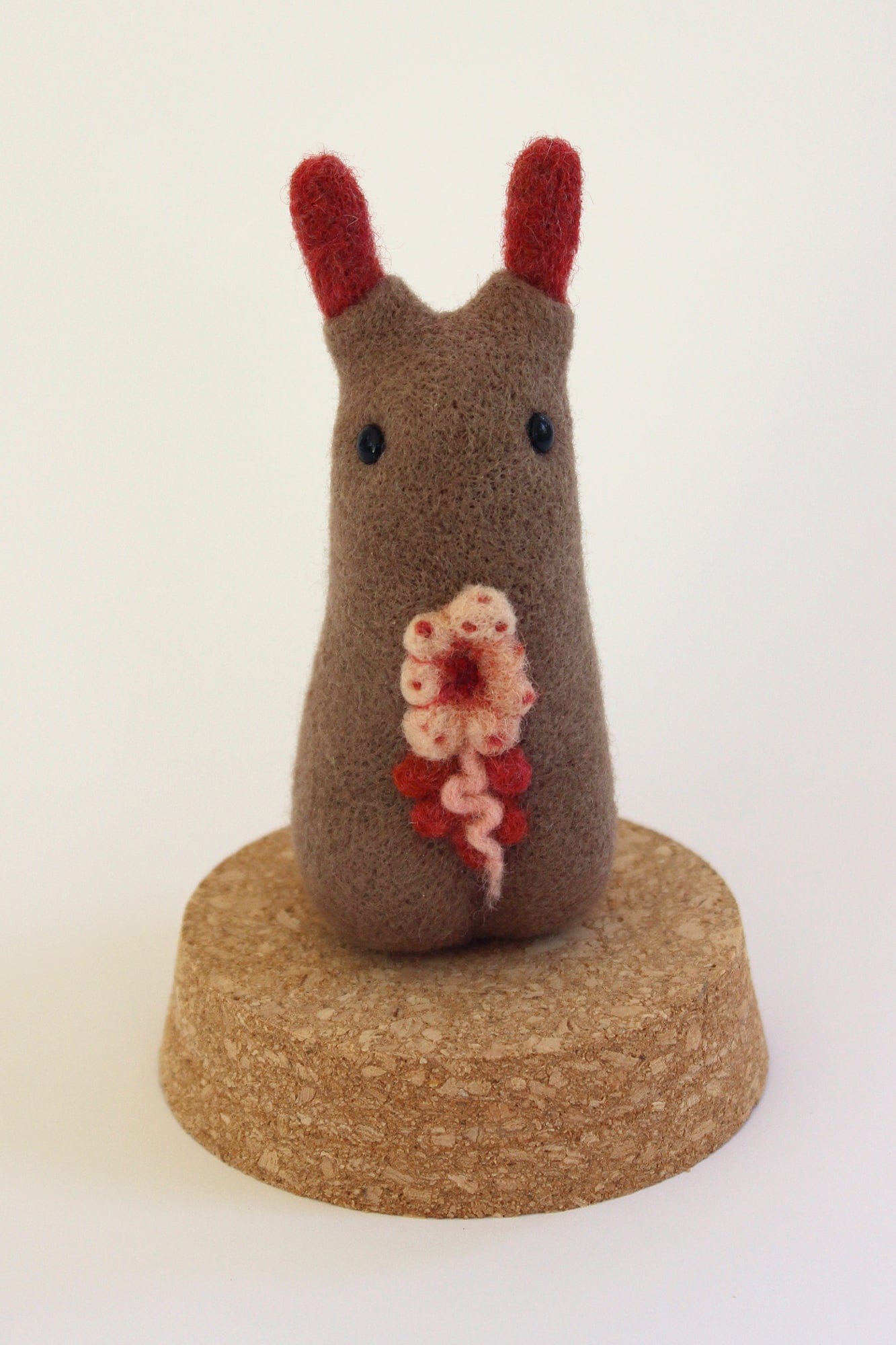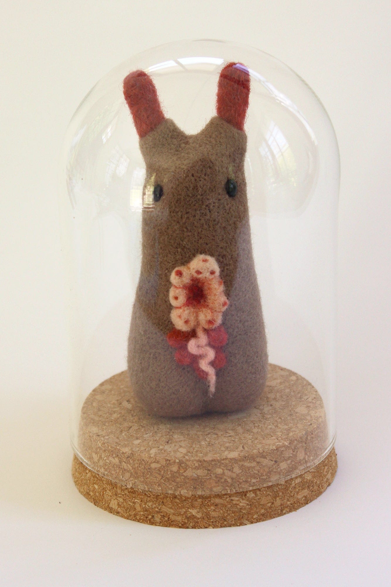 Wool fibre sculpture with glass eyes in glass bell jar by Catriona Secker (2025).