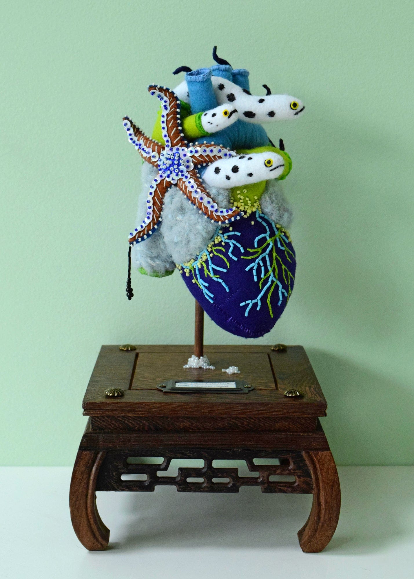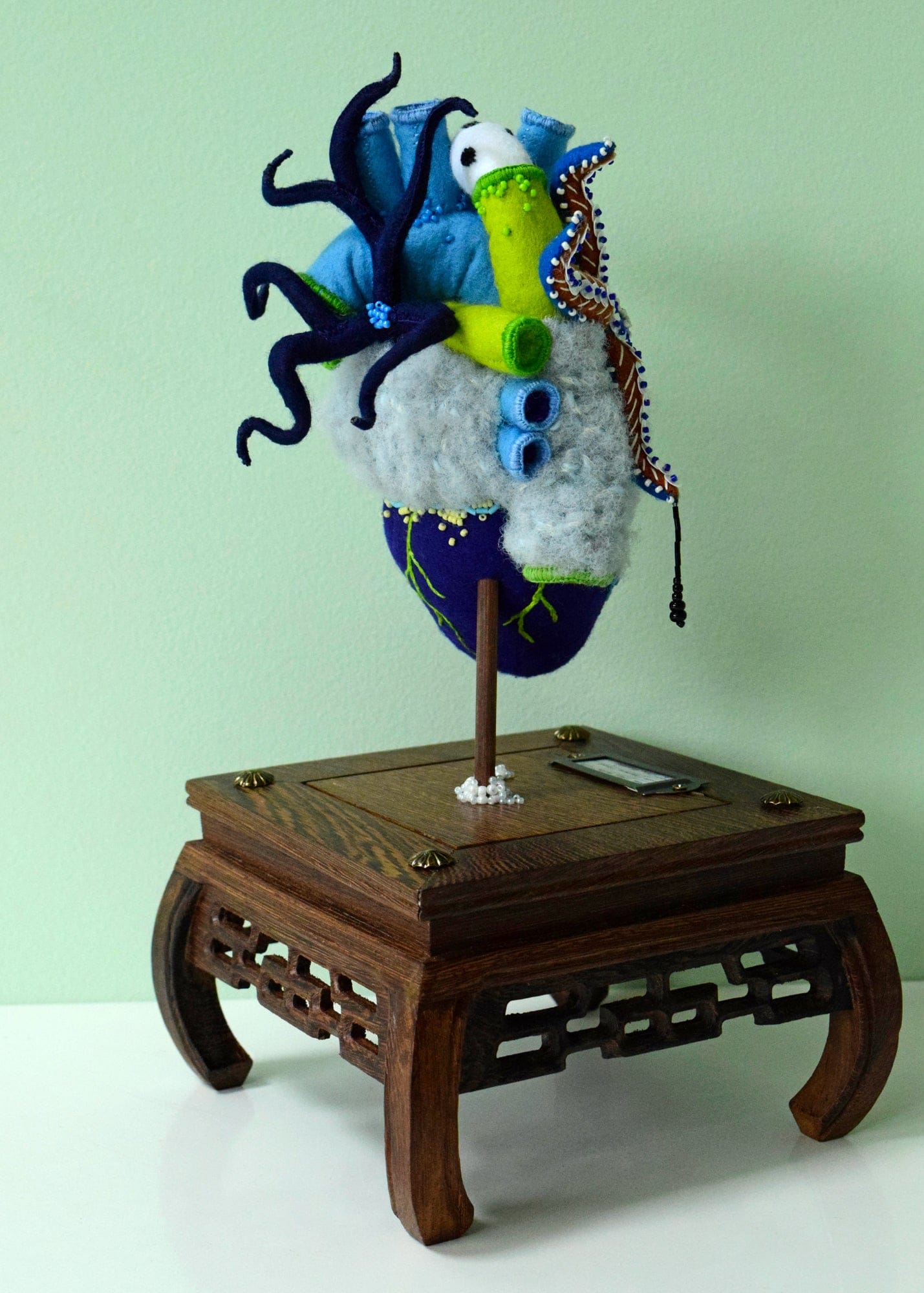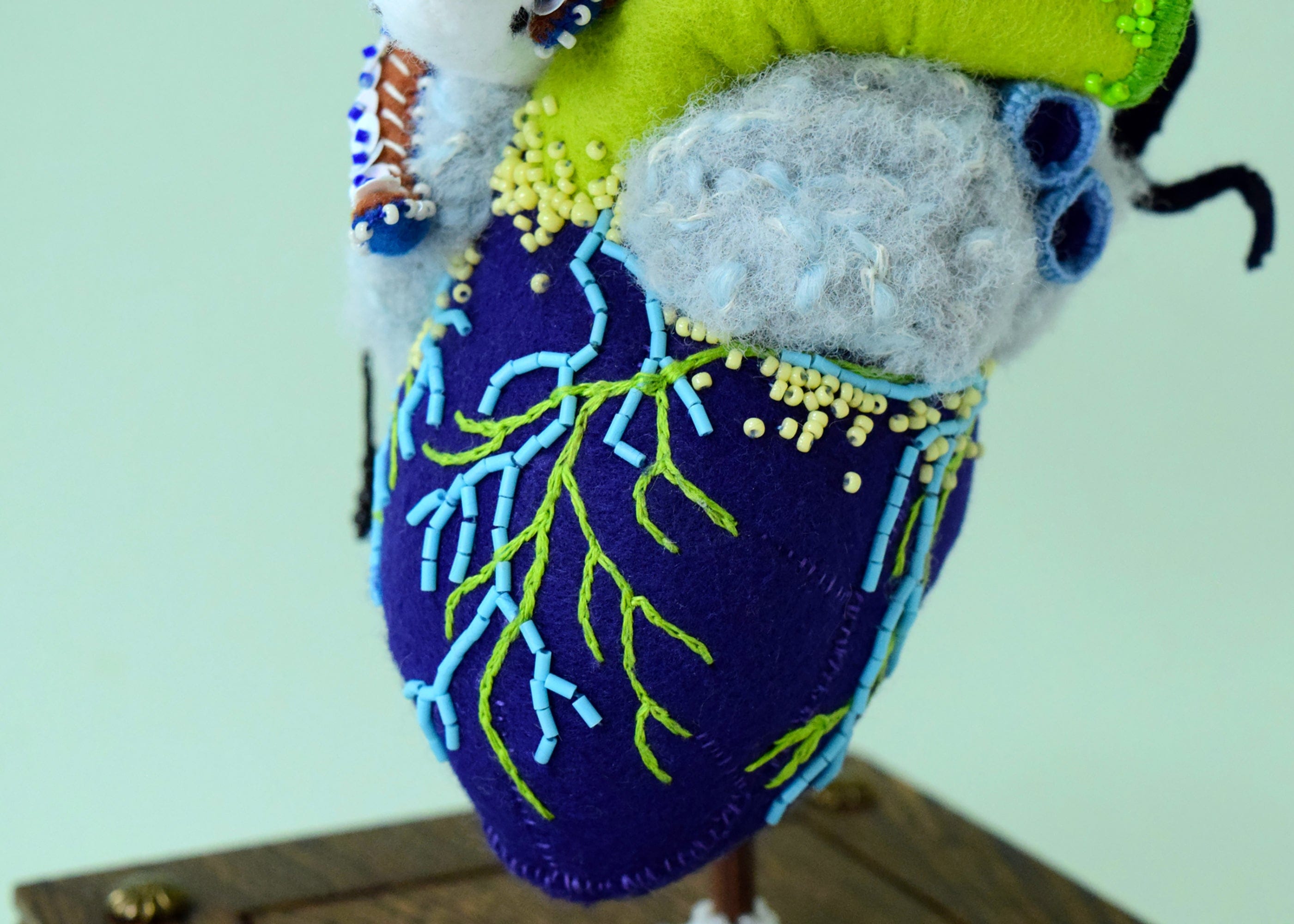Hine Mizushima - 'Anatomical Heart, Inhabited (Shallow)' - felt, beads, sequins, yarn, wood, wire and glass dome