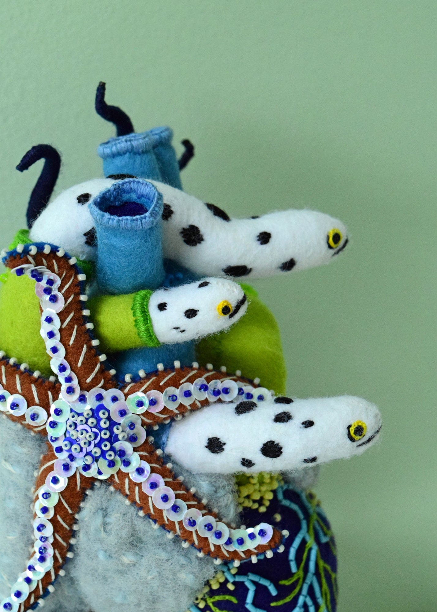 Felt, beads, sequins, yarn, wood & wire sculpture in glass dome by Hine Mizushima.