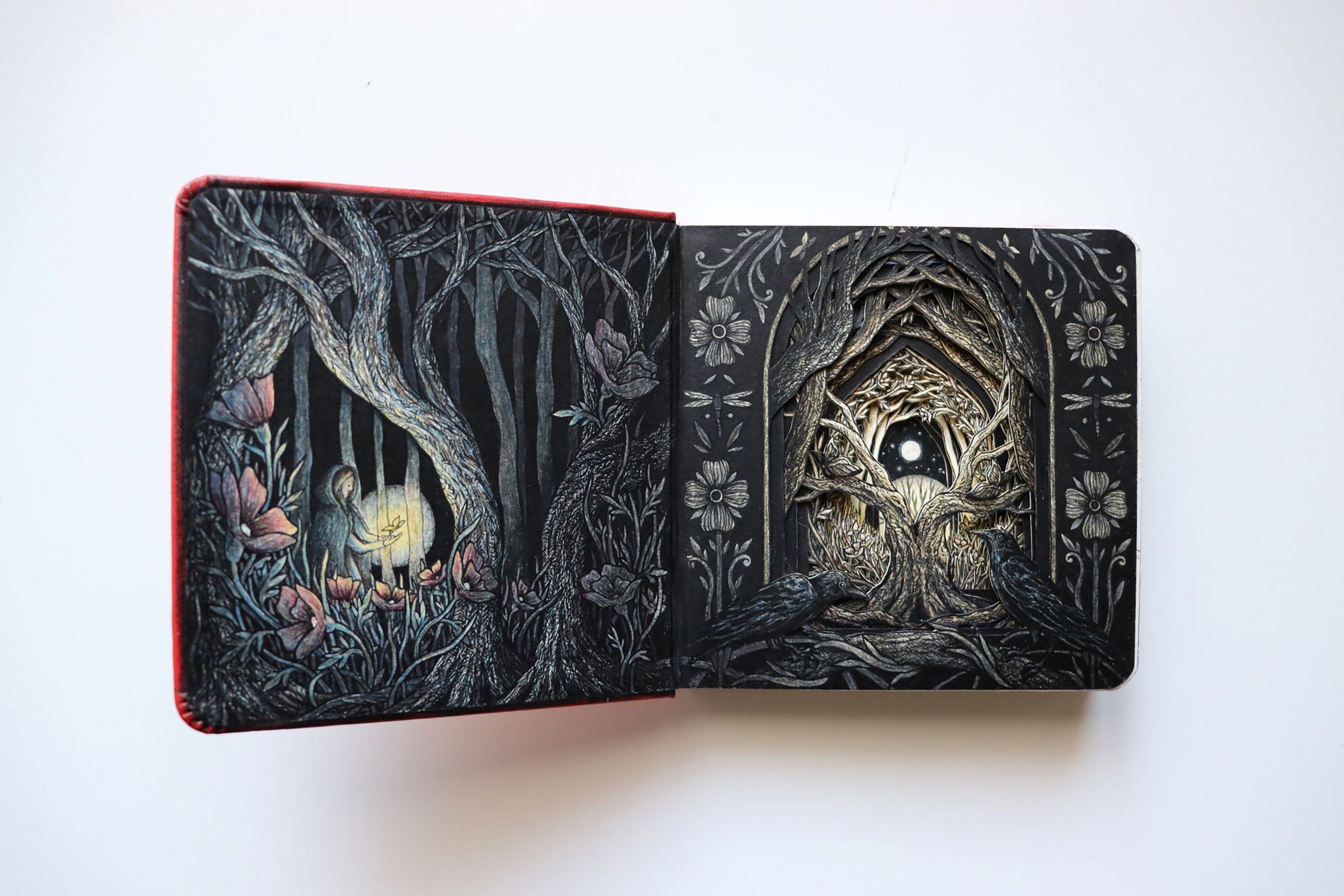 Ink and coloured pencil illustration on book with paper carving by Isobelle Ouzman.