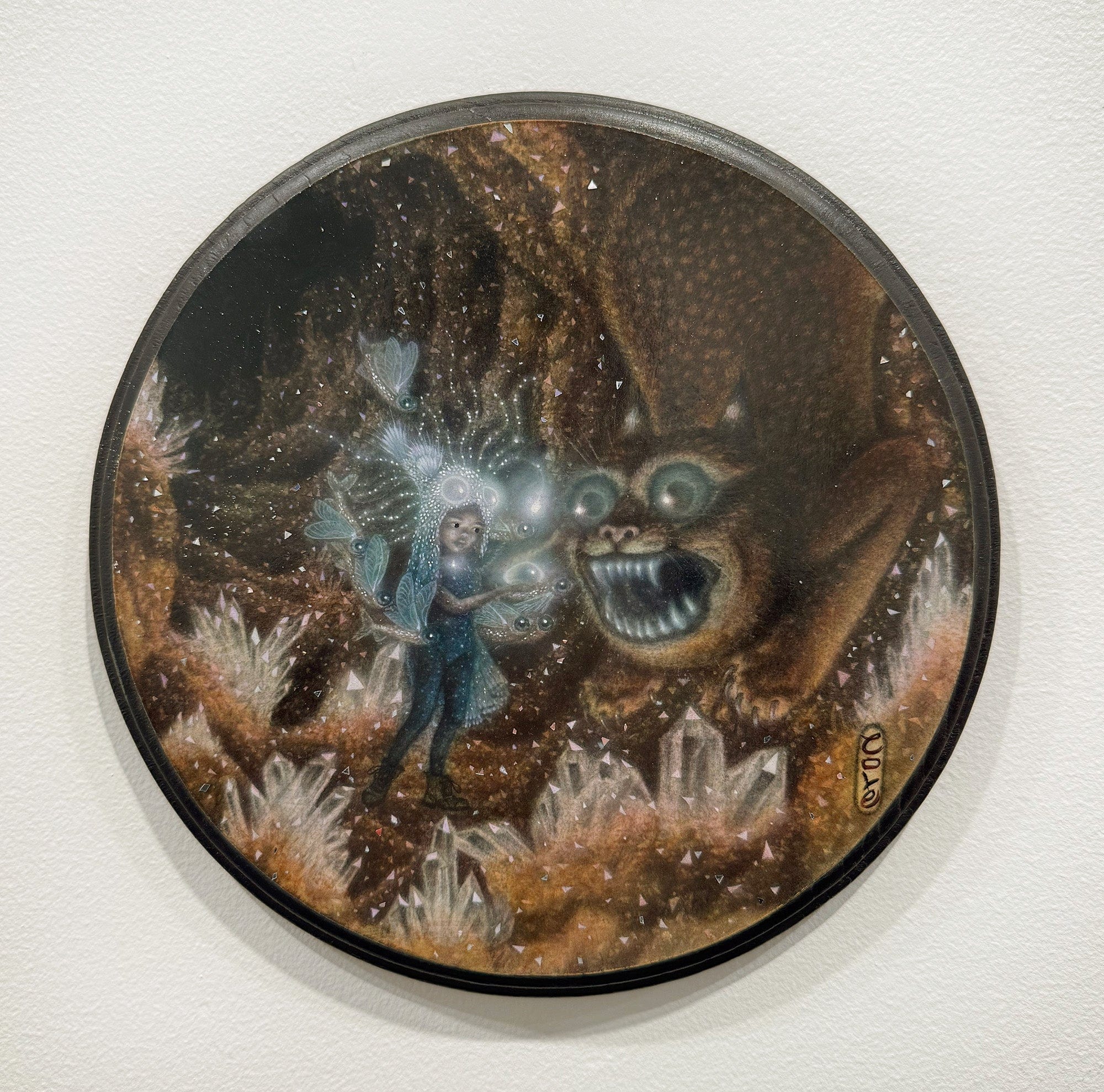 - Calamity Cole - 'Feeding the Cave Cat' - Charcoal, oil and iridescent decoupage on watercolor paper mounted to wooden plaque