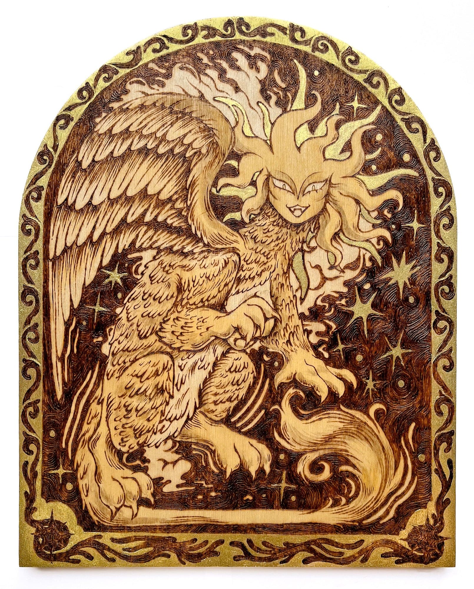 Freya Dahlstrom - 'Sphinx' - pyrography and gold ink on wood panel