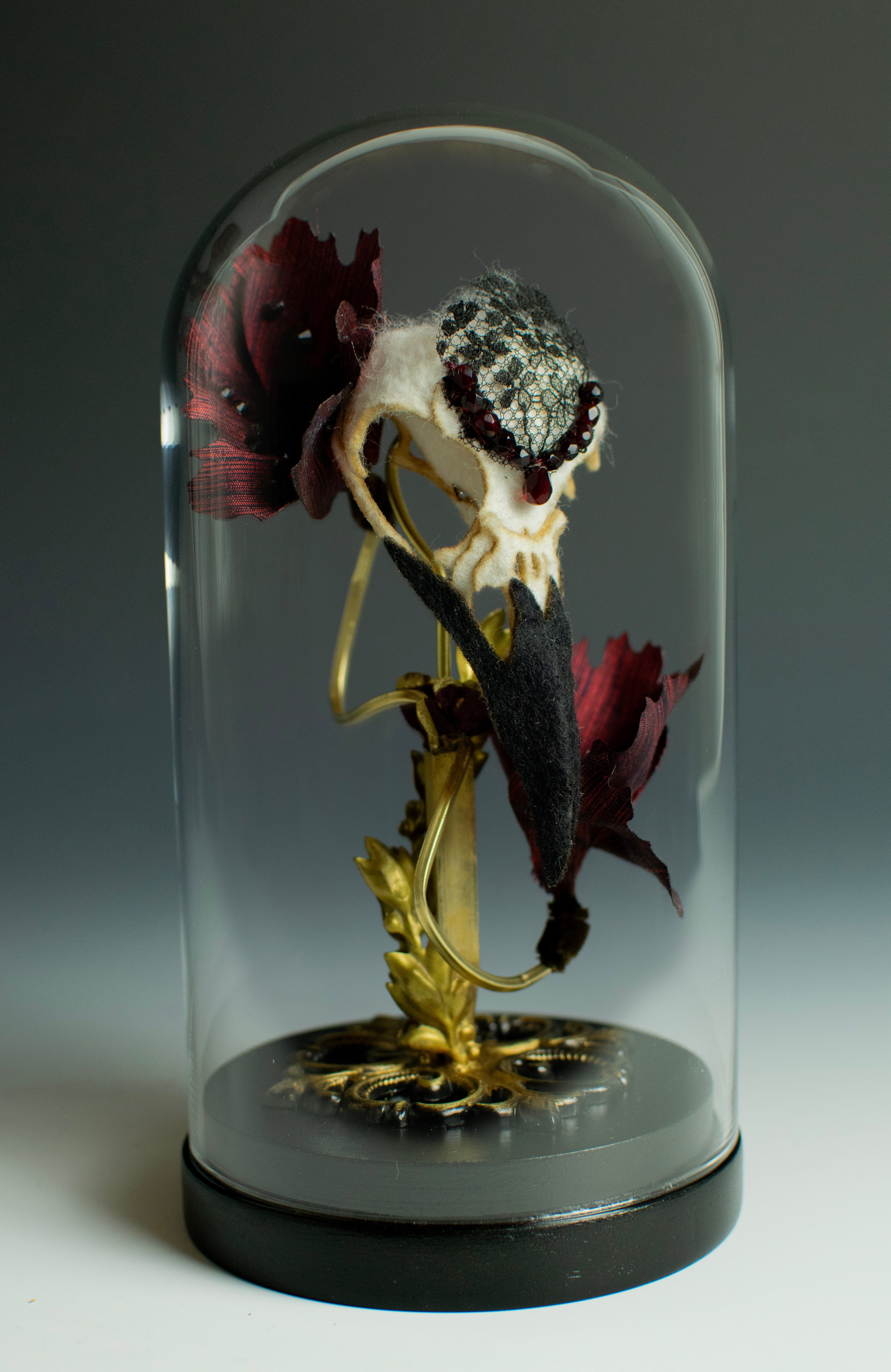 - Lana Crooks - 'Emerge 2' - hand dyed wool, antique beads, lace, silk and brass under glass dome