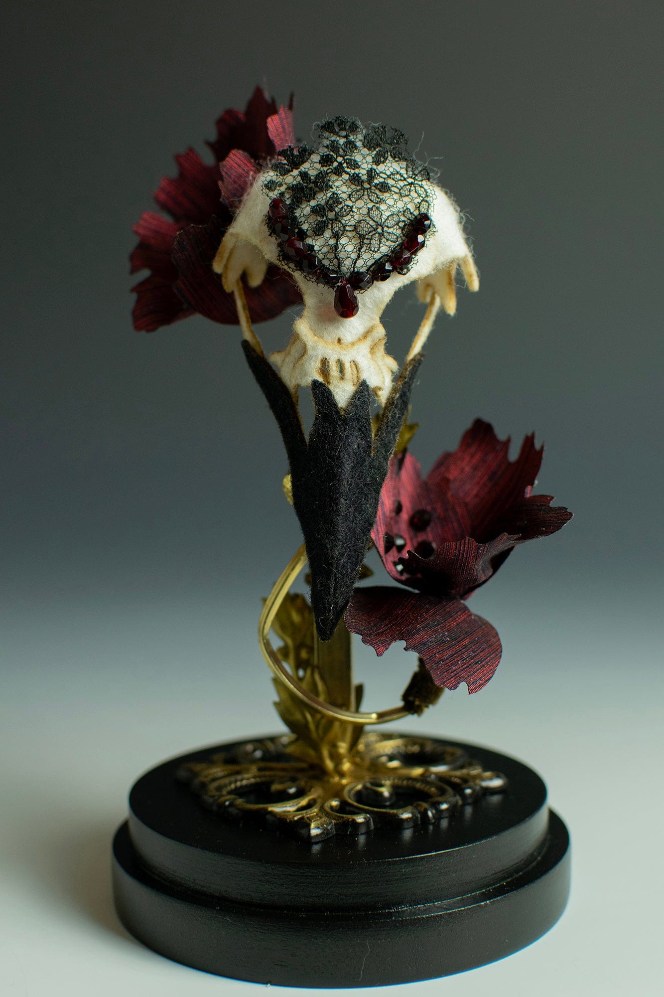 Hand dyed wool, antique beads, lace, silk and brass under glass dome by Lana Crooks (2025).