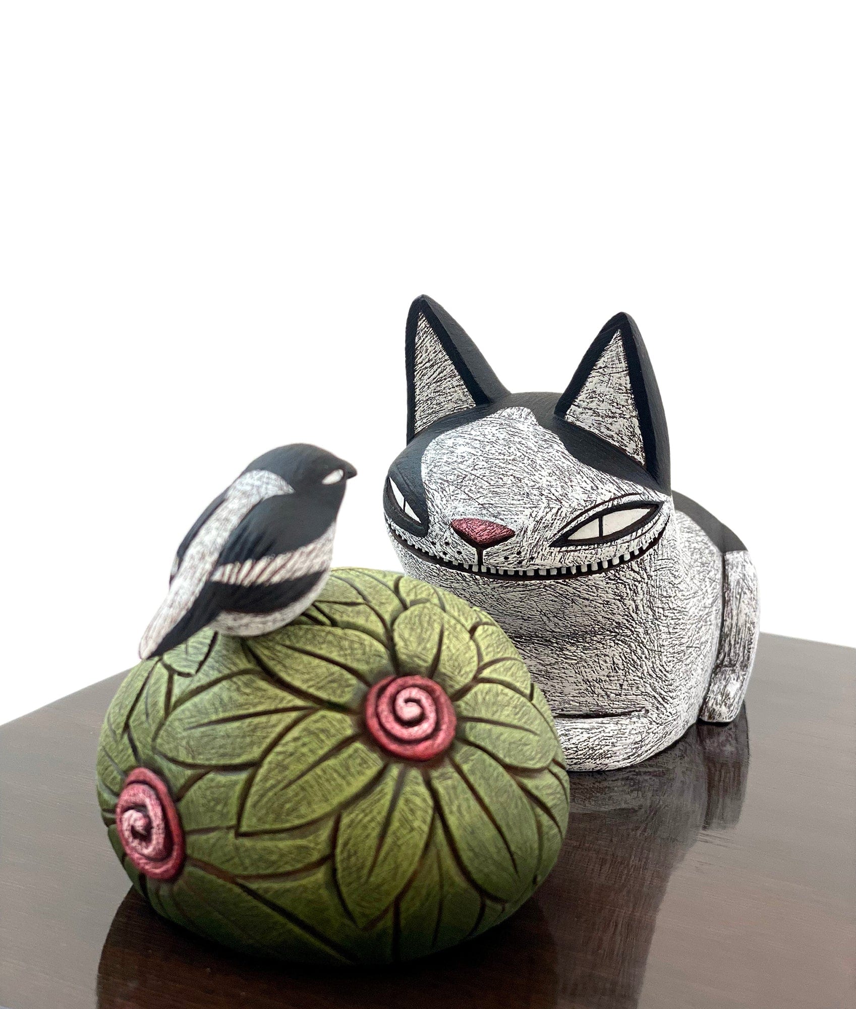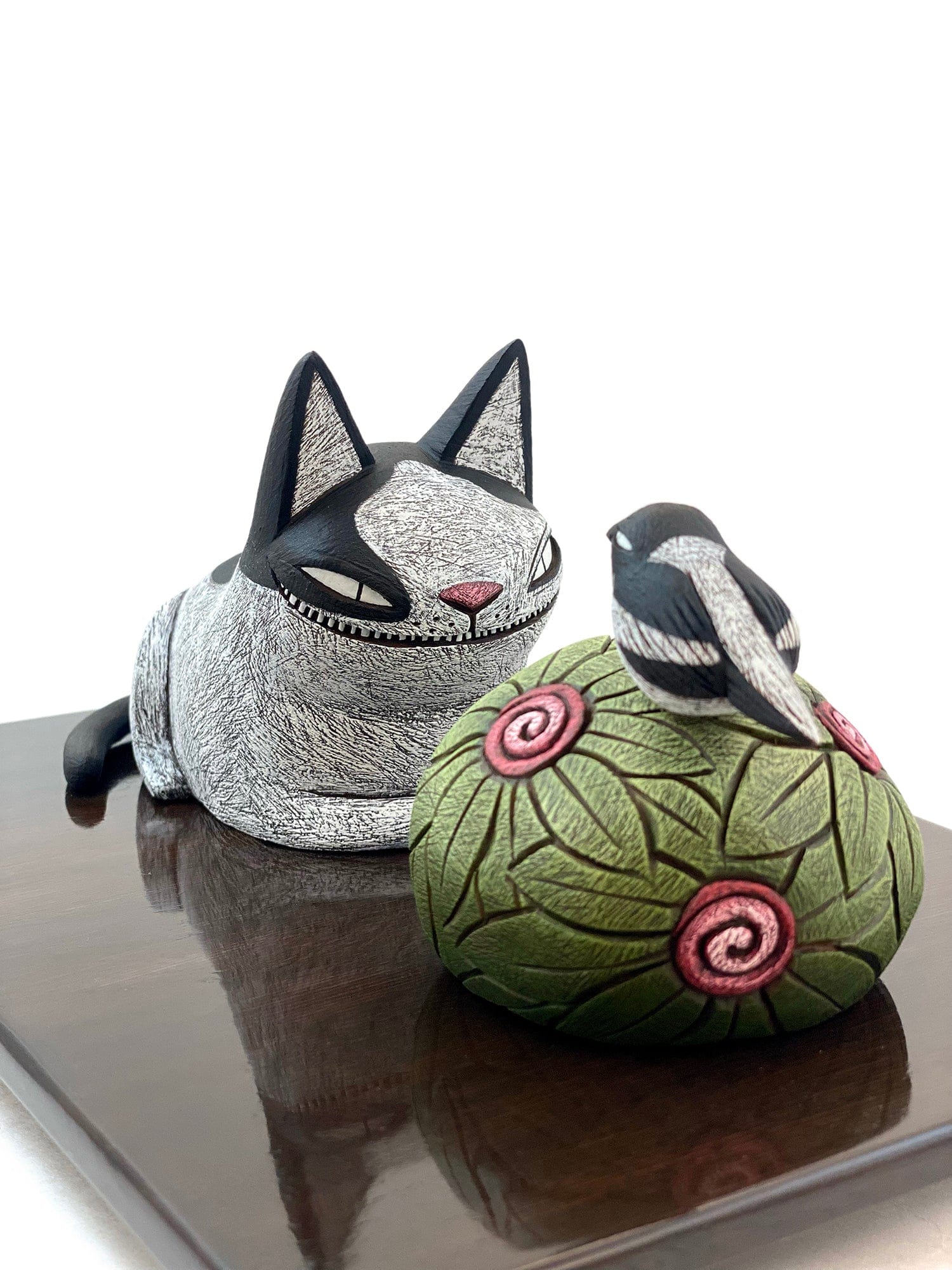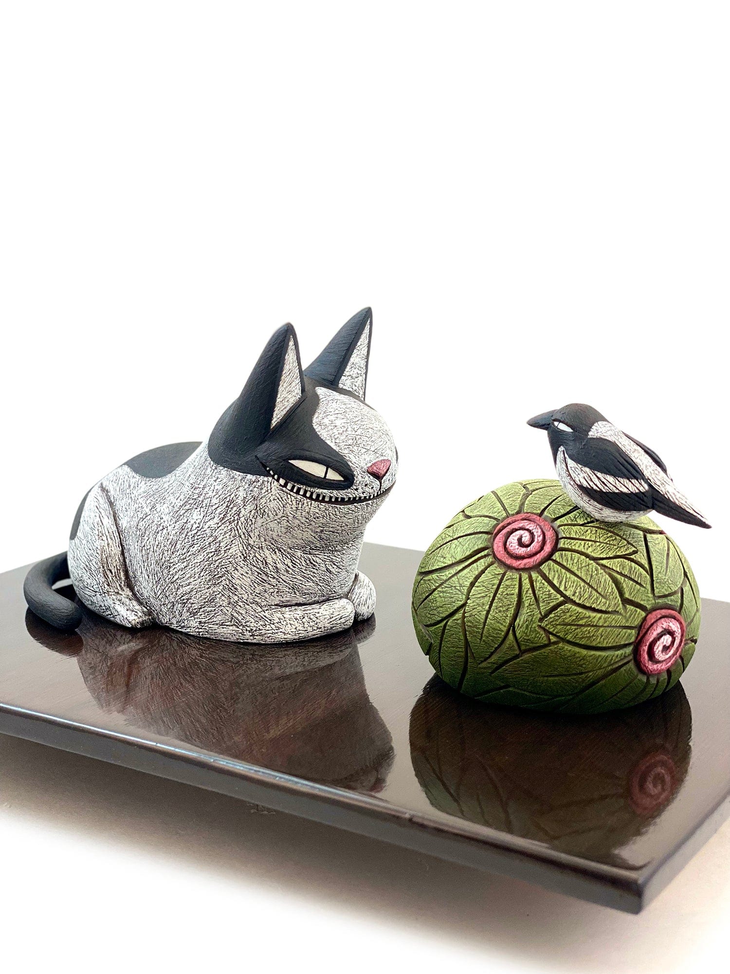 - Kim Slate - 'Just Between Us' - clay, gouache, acrylic, wire, epoxy and walnut board