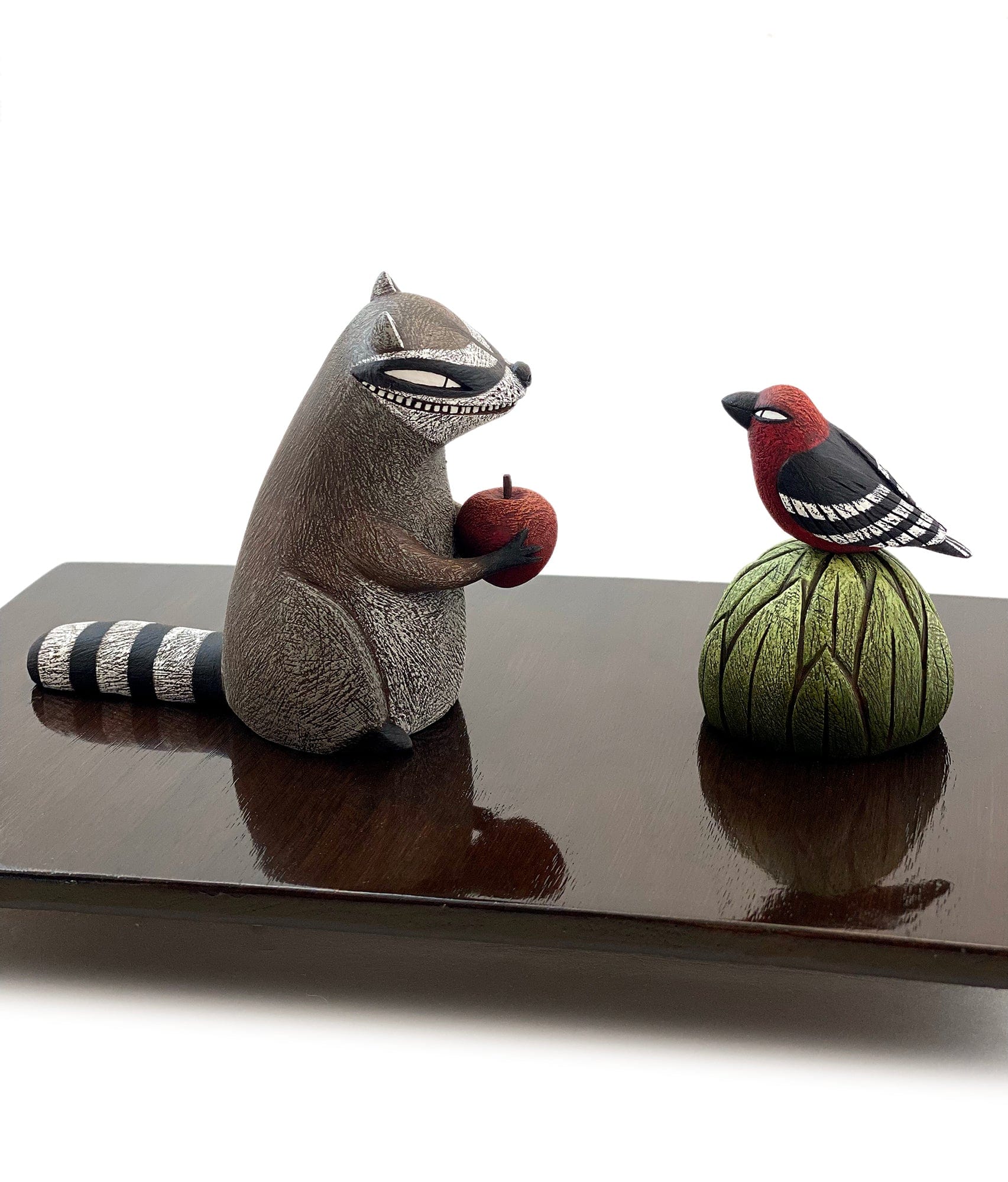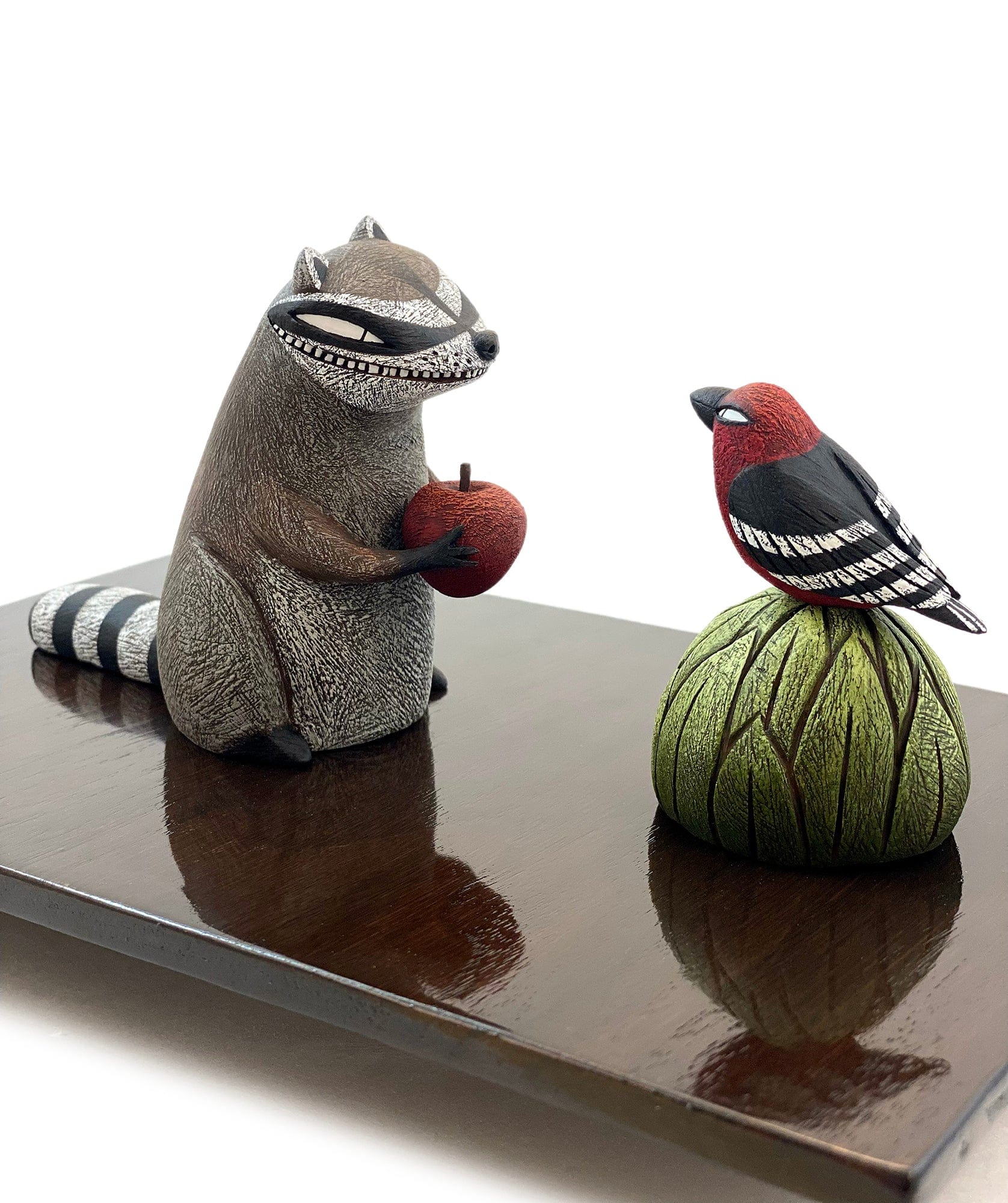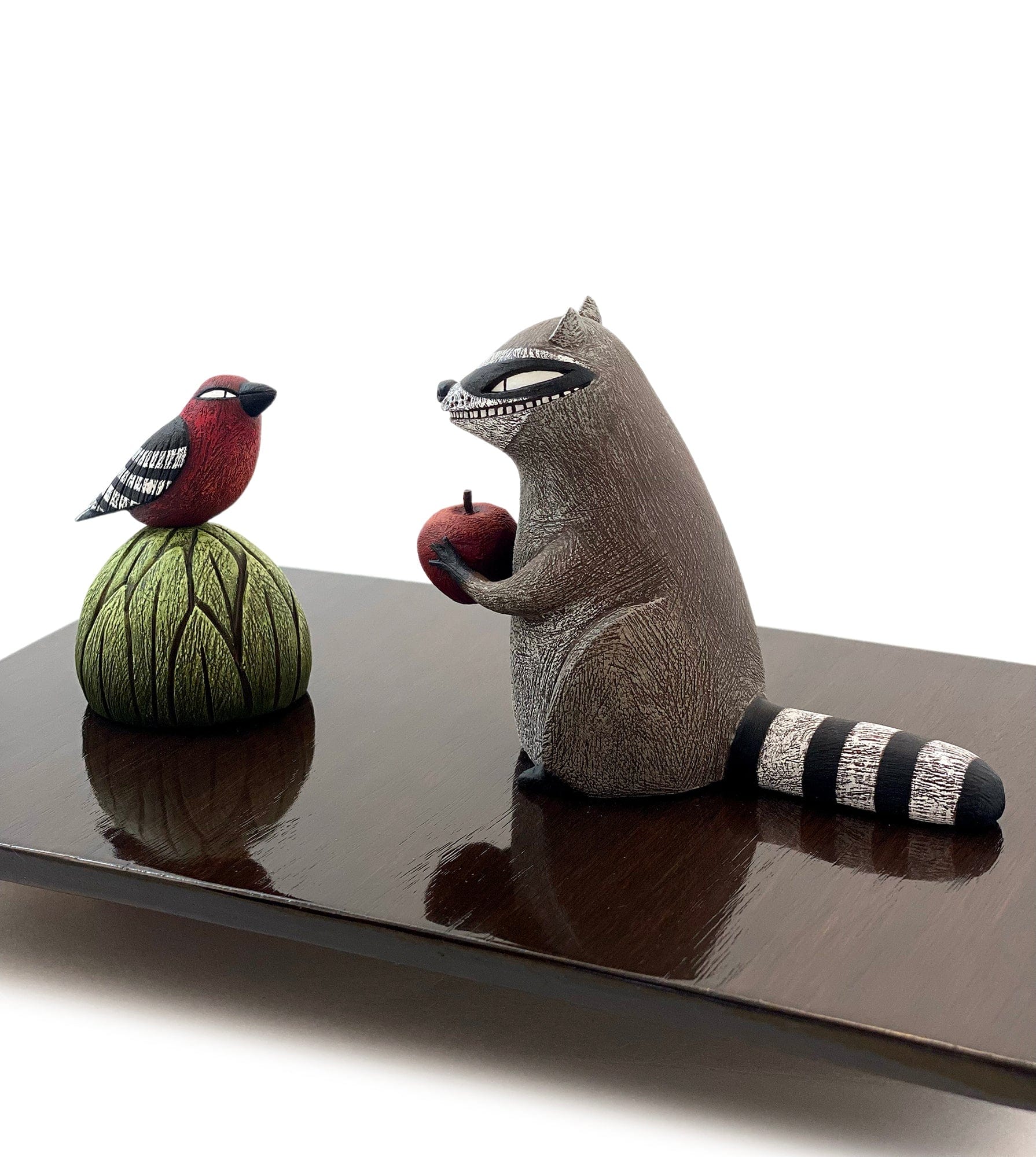 - Kim Slate - 'Just Between Us' - clay, gouache, acrylic, wire, epoxy and walnut board