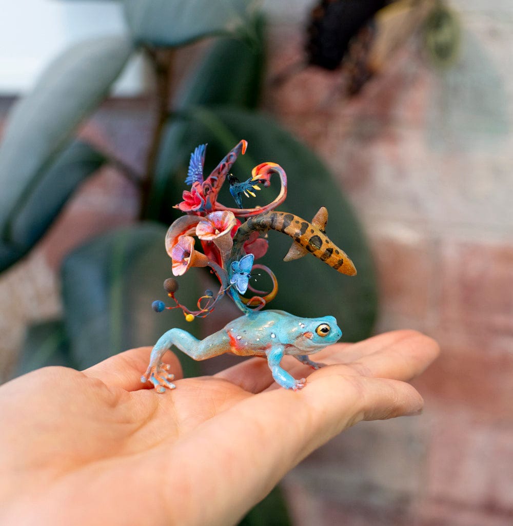 - Hannakin - 'Amphibious Clover' - wool felt, thread, wire, Sculpey and mixed media on raw pine wood base