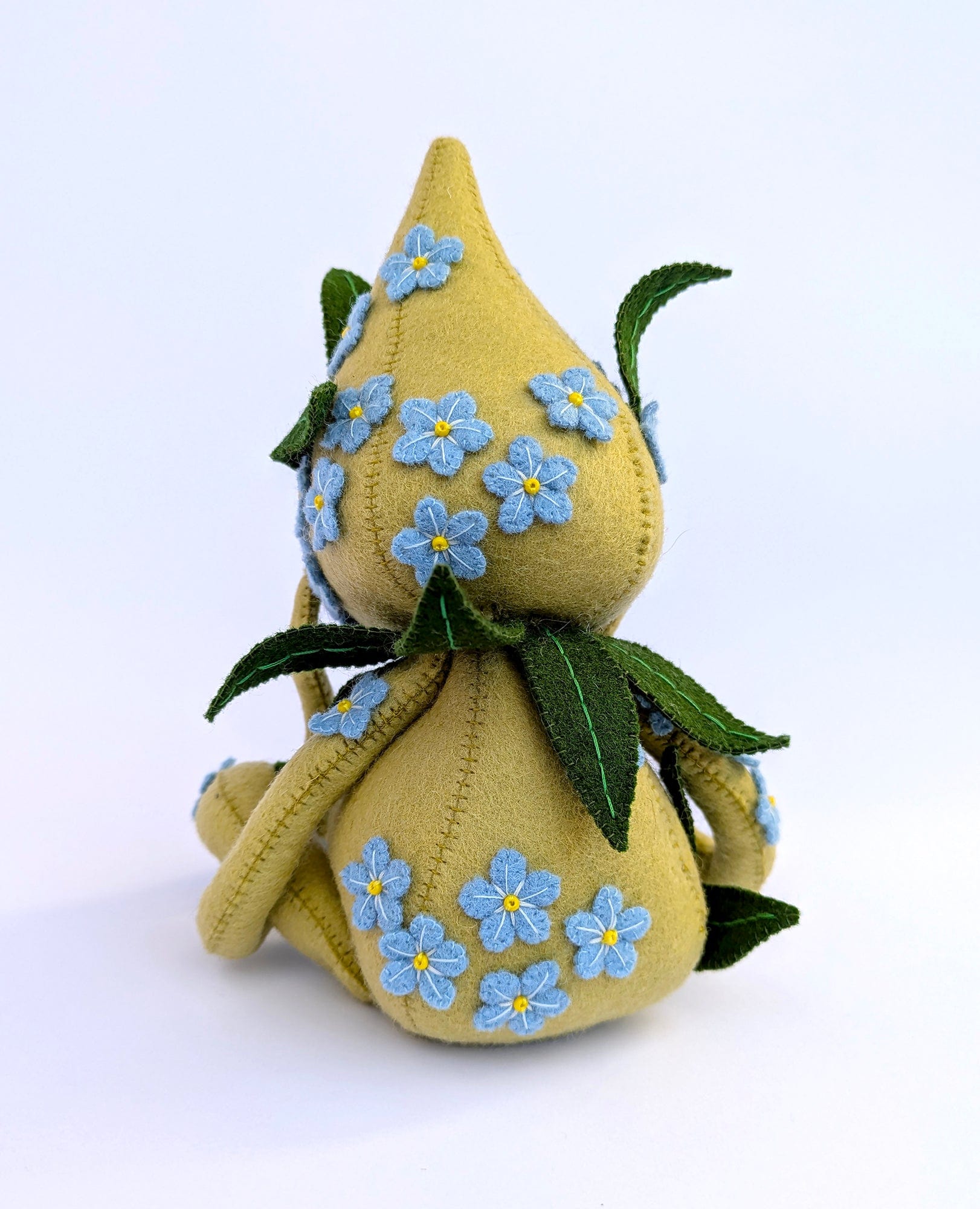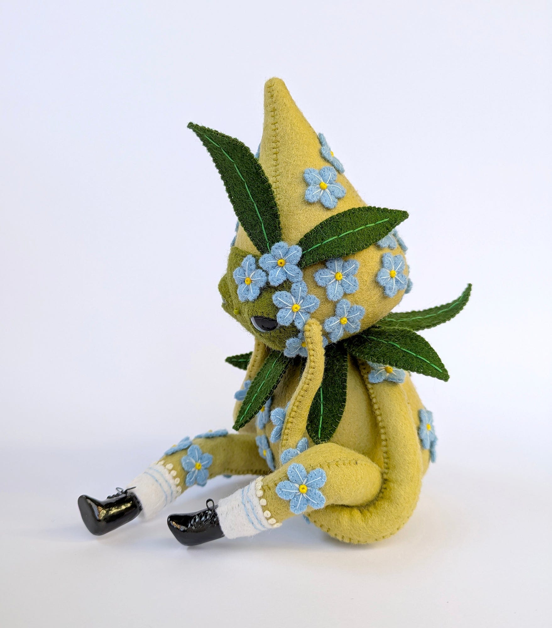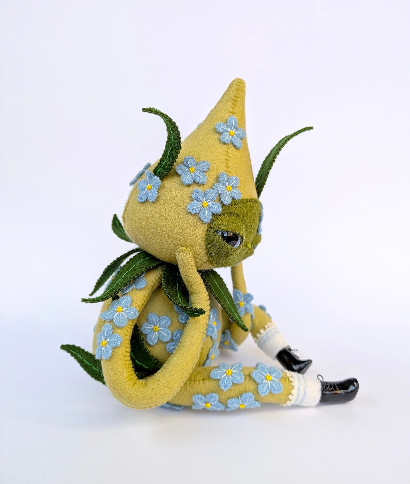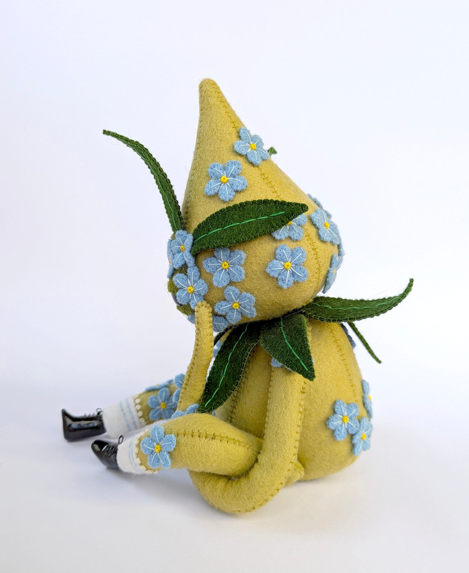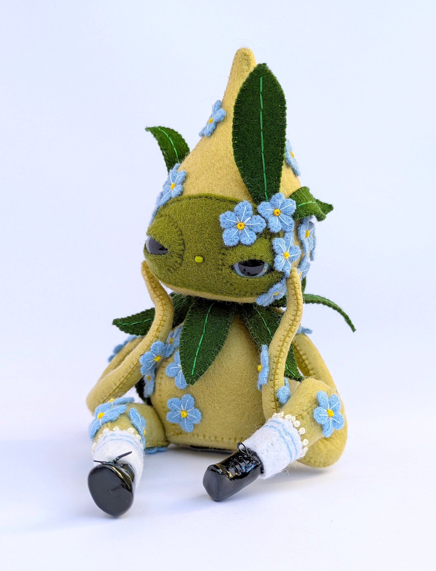 Hannakin - 'Forget Me Not' - wool felt, thread, Sculpey, glass beads and mixed media on raw pine wood base