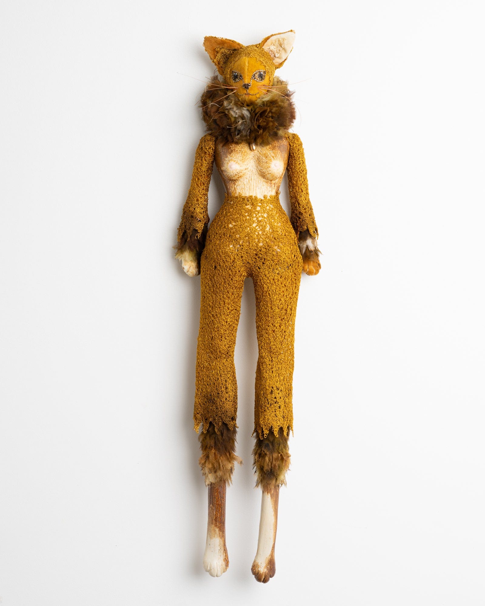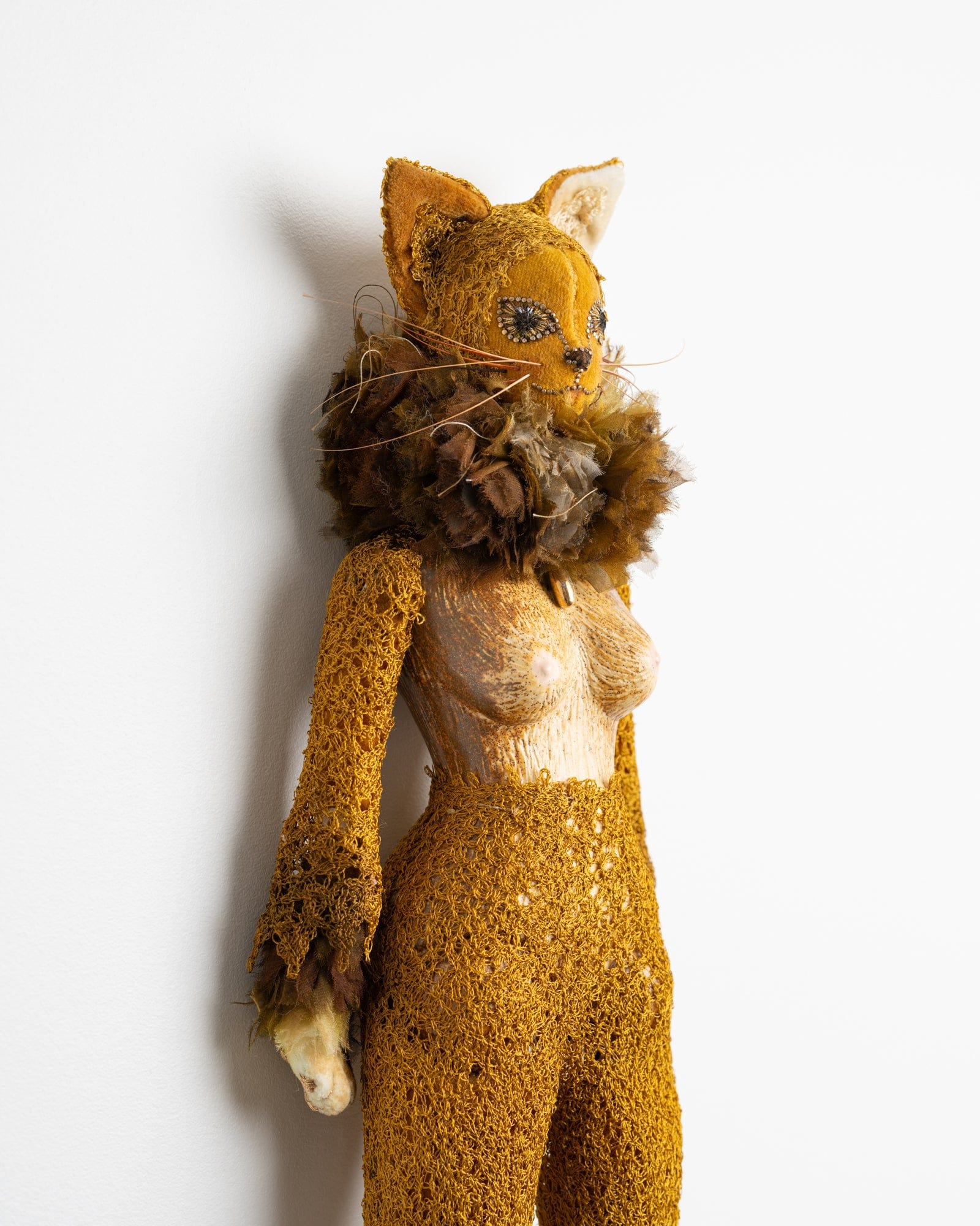 Selene Mauri Cochrane - 'Kitty Girl - Gold ' - ceramic, fabrics, various threads, hand-made chain-stitched lace, pins, rachides