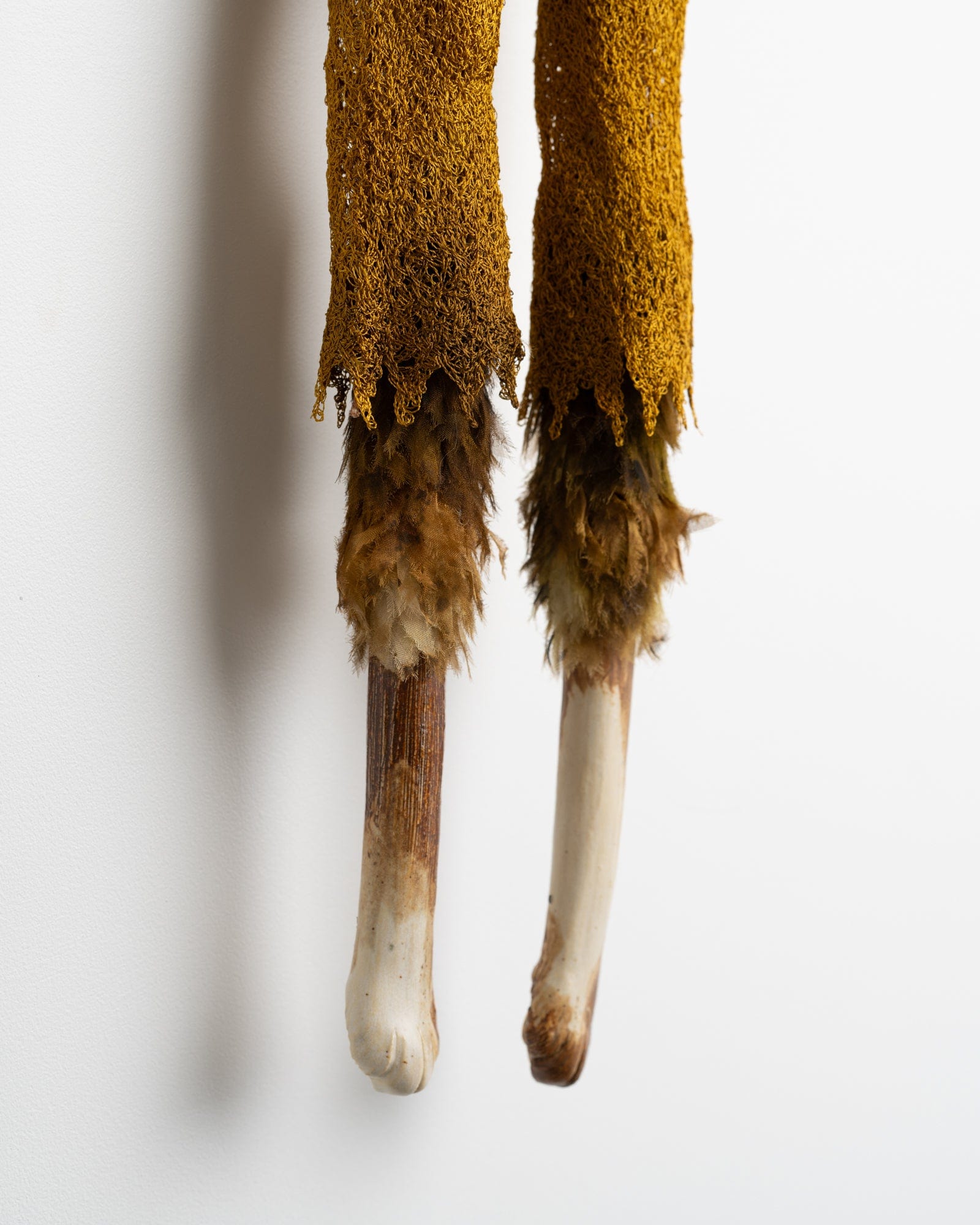ceramic, fabrics, threads, hand-made chain-stitched lace, pins, and rachides by Selene Mauri Cochrane (2025).